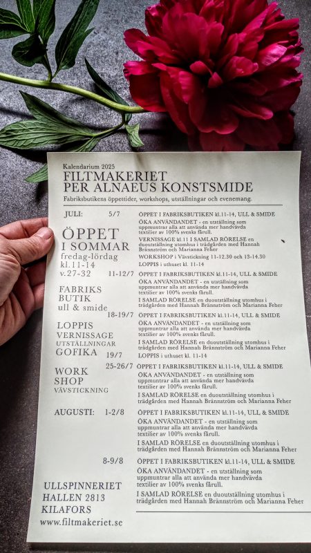 Filtmakeriets produktion följer fåråret. Efter höstklippningen arbetar vi fokuserat med sortering och tvätt tills vårvintern är över. När vårvärmen kommer stänger vi ullsorteringen och jobbar vidare med alla andra steg i beredningen. Målet är att bereda och förmedla ullen vidare innan nästa höstklippning så fler kan få njuta av dess goda egenskaper och vi kan fylla på ullförråden igen. Ull är en färskvara som mår bra av att vara i rörelse. Den har oändligt med användningsområden och är skön att handarbeta med. Vi uppskattar ullens alla fibergrovlekar och färger. Vår önskan är att ullen i våra produkter används till nyttoplagg och inredningstextilier som i sin tur används flitigt och länge!